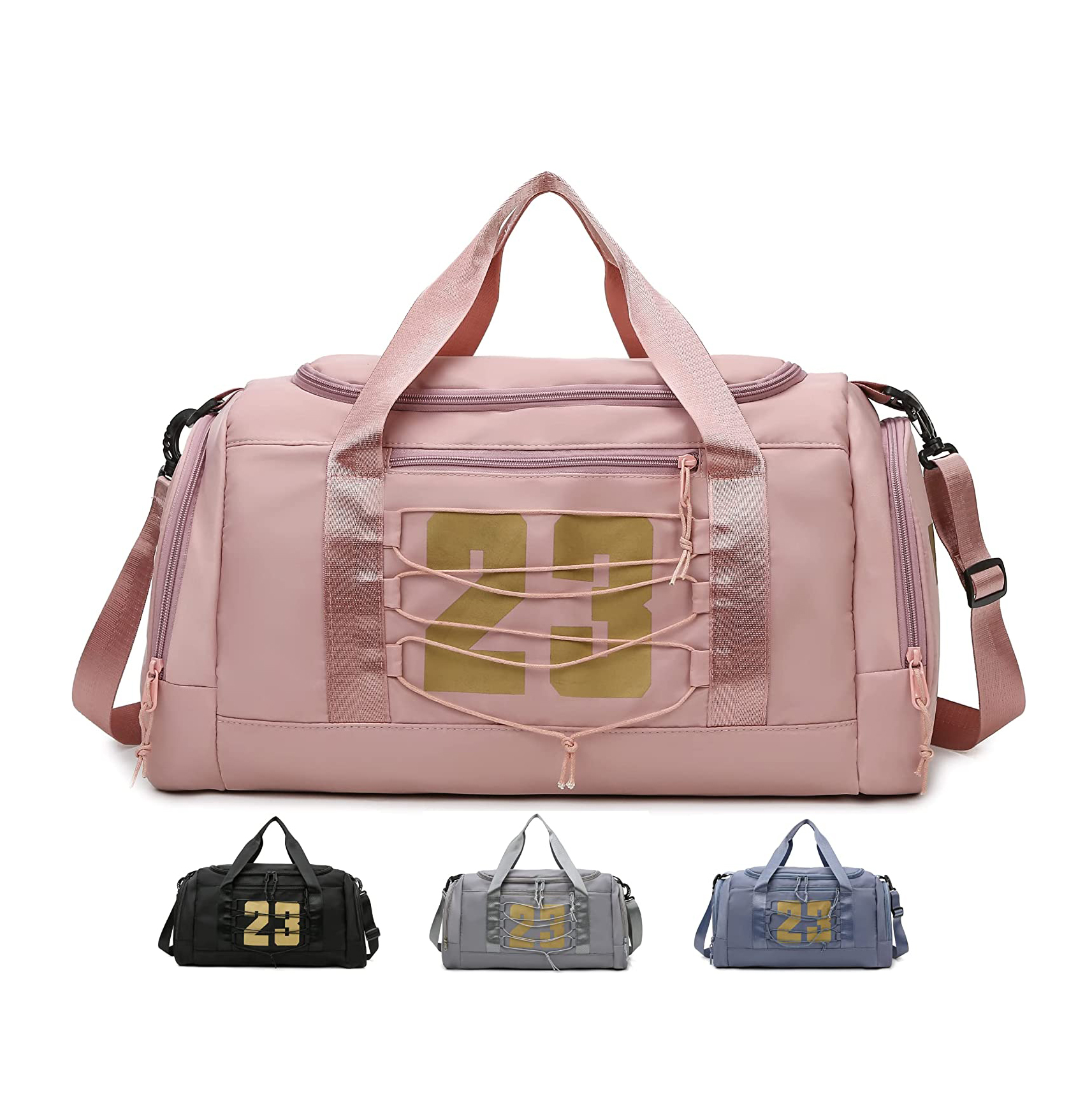 Compartimento seco de zapatos húmedos y separados La bolsa de gimnasio de Duffle Sport ofrece almacenamiento espacioso con 1 compartimento con cremallera principal grande para ropa seca y limpia o todo para el gimnasio y viajar por su vez necesario, 1 bolsillo húmedo de PVC impermeable mejorado para artículos húmedos junto con el compartimento principal. 1 bolsillo de la cremallera externo delantero y 1 para la parte delantera para el almacenamiento fácil. Compartimento con cremallera lateral en ambos lados, uno para el compartimento de zapatos con función ventilada también puede almacenar ropa, mantenerla secas y frescas, minimizando el olor.