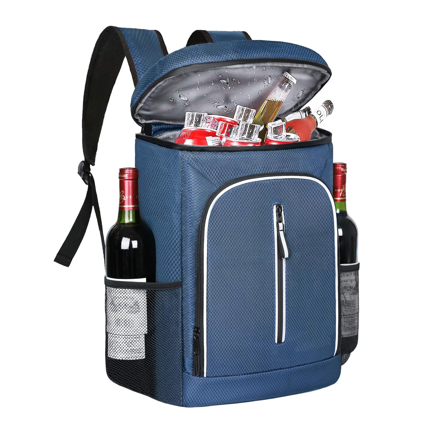 Mochilero de la capacidad espaciosa: 30 latas/30L, Medidas: 17 "x 12 " x 8 ". La mochila más fría es lo suficientemente grande como para organizar todas sus necesidades, como bebidas, cerveza, fruta, paquete de hielo, comidas, bebidas altas, bocadillos, teléfono celular, etc. También puede contener 2 botellas de vino en bolsillos laterales.